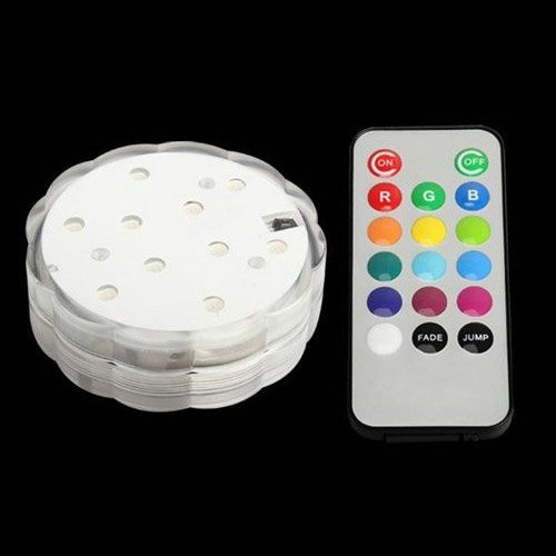 #Base lumineuse a led deco submersible à changement de couleurs.Grâce à la télécommande IRde cette base vous pourrez allumer ou l'éteindre, vous aurez la possibilité d'avoir 12 couleurs fixes (rouge,vert, bleu, orange, rose, pourpre, jaune etc... ), ou un mode blanc. Et un mode changement de couleurs lent ou clignotant.Caractéristique :Alimentation : 3 piles AAA (fournies)Autonomie : env. 20 heuresMatière : plastiqueDiamètre : 7cmHauteur : 2,5cm