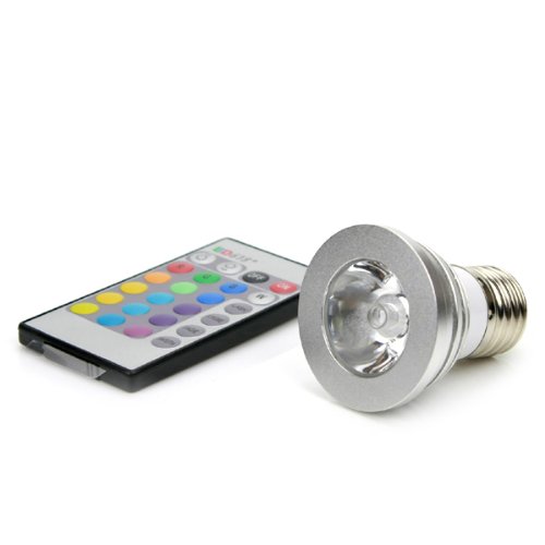 #Une ampoule LED qui change de couleur, avec une télécommande et qui s'utilise à la place d'une ampoule à incandescence standard à vis. Eclairage LED RVB (rouge, vert, bleu). Peut être utilisée en couleur fixe statique ou avec des effets de changement de couleur en appuyant sur la télécommande. Cette ampoule est capable d'émettre des Blanc, Rouge, Vert, Bleu, plus douze autres couleurs vives. En plus des différentes couleurs qui décorent votre intérieur selon votre humeur, vous avez l'avantage de réduire vos coûts d'énergie puisque cette ampoule à LED utilise seulement 3 watts d'énergie.