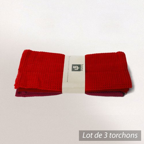 Lot de 3 torchons nid d'abeille Cocina - rouge et bordeau - 50x70 cm