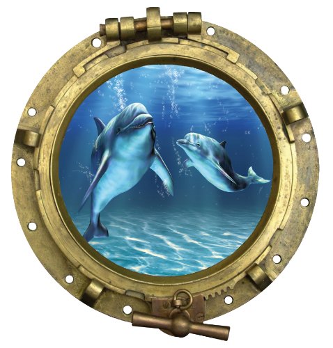 Sticker Trompe l oeil Hublot Dauphins vue sous marine 30x30cm